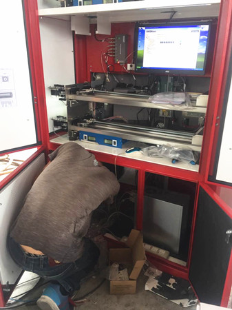 圖為工作人員正在對發卡機內部進行接線