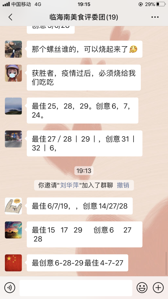 圖為評委團評選 本次活動共32幅作品進行參評,最終評選出朱英英的《鳳尾蝦球》、謝海云的《饞嘴螺絲》、李菊麗的《昂翔展翅》、陳瑩的《骨色骨香》為“最佳作品”,朱英英的《孔雀開屏》、葉懿慧的《向陽花》、吳琴琴的《秋收》為“最有創(chuàng)意作品”。大家紛紛相約疫情過后,以廚會友、以食為樂,來一場百家宴一飽口福。 陳瑩