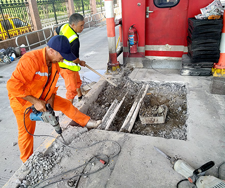 圖為施工現(xiàn)場 臺州收費所目前有兩個進口人工車道,加上ETC,日均進口流量7000多輛,車流高峰期經(jīng)常出現(xiàn)擁堵現(xiàn)象。隨著自助式發(fā)卡機的應(yīng)用,標志著該所服務(wù)系統(tǒng)將向自動化、智能化轉(zhuǎn)變,24小時提供服務(wù),極大地發(fā)揮人工輔助作用,提高車道使用率,有望緩解收費站入口車輛的通行壓力。