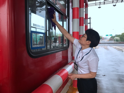 圖為工作人員打掃收費(fèi)崗?fù)ばl(wèi)生