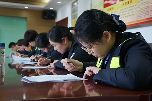 圖為筆試現(xiàn)場 比賽分筆試和現(xiàn)場問答兩部分,內(nèi)容涉及收費政策、業(yè)務(wù)知識、特情處理、內(nèi)控管理制度。筆試試題分成6份,參考人員隨機選題,各班組分批閉卷測試,最后取班組平均分進行排名。現(xiàn)場問答由必答題、搶答題、場外題等多個部分組成,采用累積計分、搶錯答錯扣分方式進行。各組以班組為單位每班派出3名選手,分成四組,其他班組人員則參加場外搶答。 “開具高速公路電子發(fā)票可下載“票根”APP或登錄票根網(wǎng)的網(wǎng)址是?” “車道移動支付掃碼設(shè)備連接異常,導(dǎo)致無法支付,需要做哪些?”