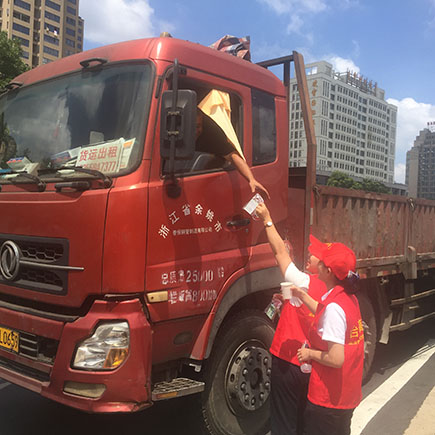 圖為骨干人員為過往司機(jī)遞上降溫降暑用品