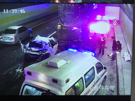 圖為事故現(xiàn)場 情況緊急,一接到指令,巡邏車立即在南廣場調(diào)頭,趕赴事故現(xiàn)場。而此時較大的車流量已造成后方堵車,導致巡邏車被堵在隧道口,執(zhí)勤隊員怕時間耽擱太久,便火速跑到事故現(xiàn)場,第一時間將車里的人員救出。所幸轎車內(nèi)四人只有一人腳上受傷,中控立即拔打120急救電話。在他們還在施救的時候,追尾事故卻頻頻發(fā)生,500米左右、1300米左右的超車道上先后發(fā)生兩小車、三車追尾事故,隧道內(nèi)排起了長龍。為了保證在最短時間內(nèi)恢復正常通行,執(zhí)勤隊員忙著奔赴現(xiàn)場指揮預(yù)警,應(yīng)急救援有序展開。 現(xiàn)場,監(jiān)控中心、交警、執(zhí)勤隊等部門分工協(xié)作,整個施救過程一直持續(xù)到中午12點多才順利完成。盡管執(zhí)勤隊員到現(xiàn)在都滴水未進,但每個人臉上繃緊的神經(jīng)終于都得到了放松。 林玲