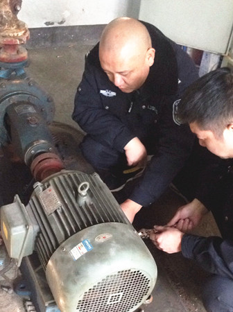 圖為工作人員修理水泵電機現(xiàn)場 因設(shè)備比較陳舊,而且原圖紙等資料不全,構(gòu)造原理無從了解,黃土嶺隧道所所長助理金衛(wèi)軍帶領(lǐng)執(zhí)勤隊,一邊推測,一邊根據(jù)水泵工作原理和電器修理經(jīng)驗尋找故障點,對設(shè)備可能出現(xiàn)的問題進行反復推敲,逐一排查,最終確定為上水位控制繼電器觸點接觸不良造成導電故障。經(jīng)過對觸點的調(diào)整和修復,以及對軸承部位進行加油和電機、水泵平衡重新調(diào)節(jié)后,設(shè)備之前出現(xiàn)的電機震動、聲音異?,F(xiàn)象和無法自動進水等問題被一一解決,消防水泵恢復正常運作。 此次檢修工作不僅及時消除了安全隱患,確保設(shè)備隨時處于良好的待命狀態(tài),在檢修的過程中,也為隊員開展了一次良好的技術(shù)培訓。 毛譯聆
