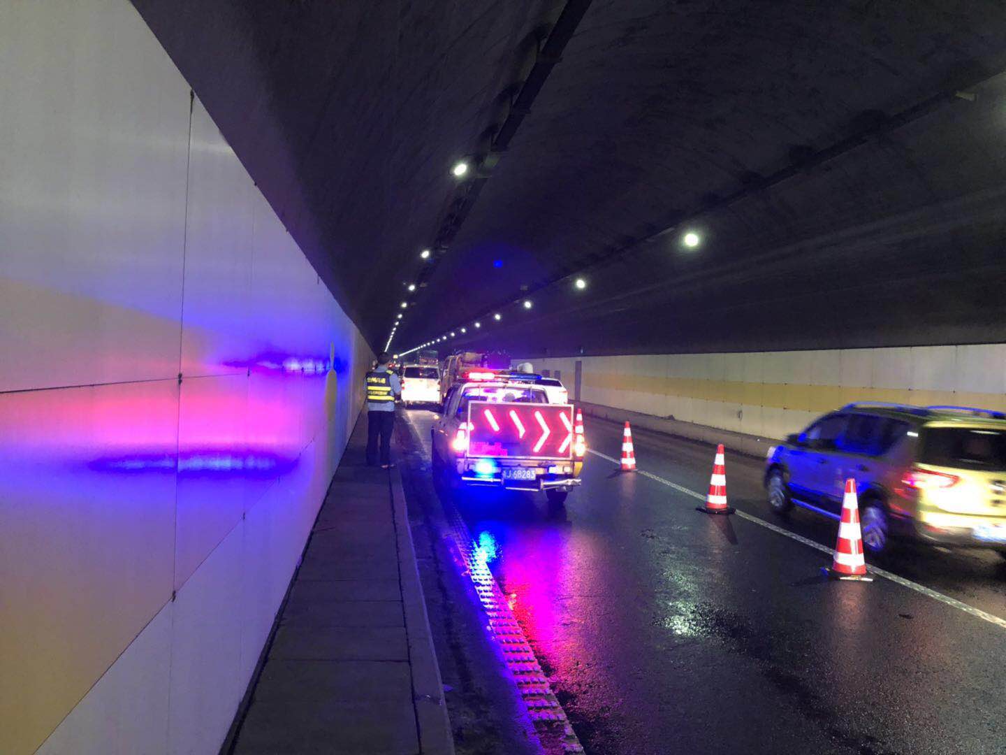 7月14日19時22分,中控員朱金飛發現黃土嶺寧向隧道1000米快車道處有車拋錨。立刻呼叫執勤隊前往處置,隨即更改快車道交通信號。 執勤隊迅速出警,幾分鐘后就趕赴事故現場,發現一輛白色面包車撞在隧道內右側,車輪箍嚴重受損,卡在護溝里,所幸無人員受傷。執勤隊進行提前預警,預防二次事故的發生,并呼叫高速施救車輛支援,幾分鐘后施救車抵達,事故車輛安全拖離隧道,僅僅十分鐘,交通就恢復暢通。
