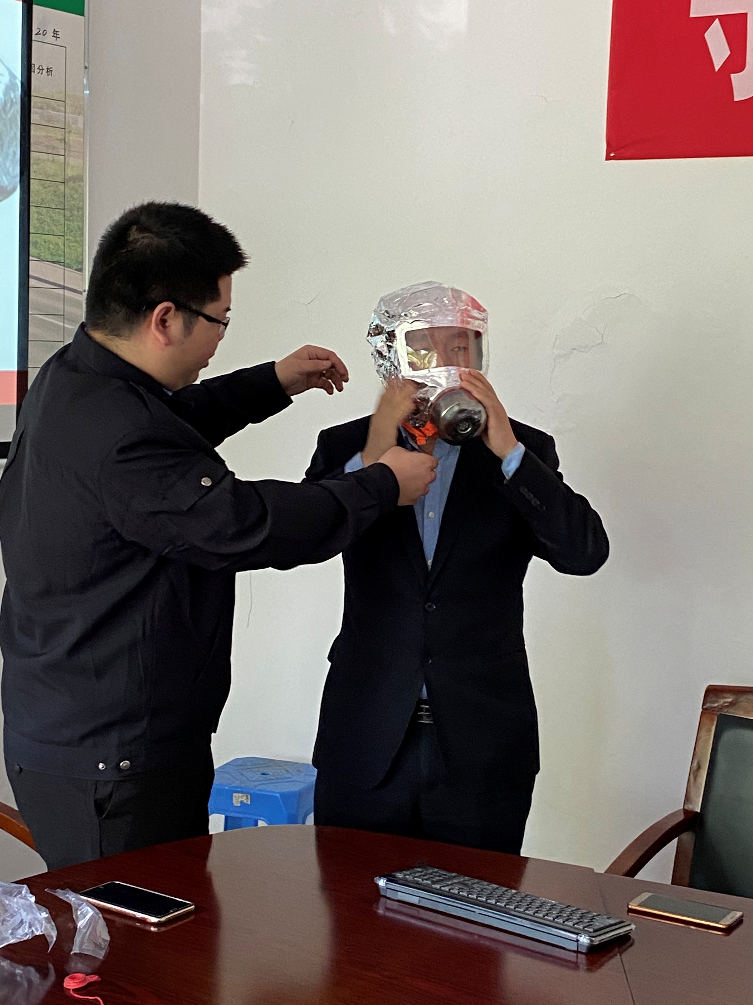 圖為空氣呼吸器佩戴演練 培訓分為講座和演練兩個部分。在培訓課上,臺州消防大隊楊教官結合近年來發生在臺州觸目驚心的火災案例,以視頻、圖片的形式生動地闡述了消防安全工作的重要性和嚴峻性,通過現場展示詳細介紹了干粉滅火器、水基滅火器的各自特點和使用方法、適用的場所,全面介紹了日常工作生活中應注意的消防安全細節以及如何撲救初期火災,火災中如何自救、空氣呼吸器佩戴使用、逃生等知識。