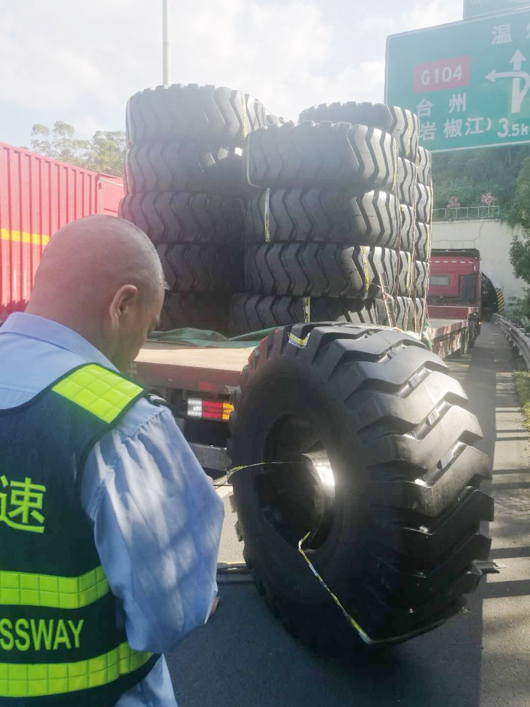 執(zhí)勤隊接警后立即趕往事故地點,一輛運載輪胎的貨車停靠在主車道,其中一個巨型輪胎滑落到硬路肩上,致使后方車輛紛紛避讓。為及時消除險情,執(zhí)勤隊快速在現場做好安全警戒工作,同時將現場情況反饋給監(jiān)控中心。由于貨車綁繩索松動,重達300多斤的輪胎脫落在地,隨后執(zhí)勤隊協同施救中心、駕駛人員合力將掉落的輪胎先拖至車旁,經過長達半個小時的搶險,跌落的貨物終于完好無缺地回到貨車上,道路恢復暢通。 筆者溫馨提醒:在高速公路行駛過程中,駕駛人應注意將車上的貨物固定好,途中要隨時注意貨物及捆綁繩索是否松動。無論是車輛撒落物還是人為拋灑物,都會給道路安全暢通埋下了重大隱患! 林玲
