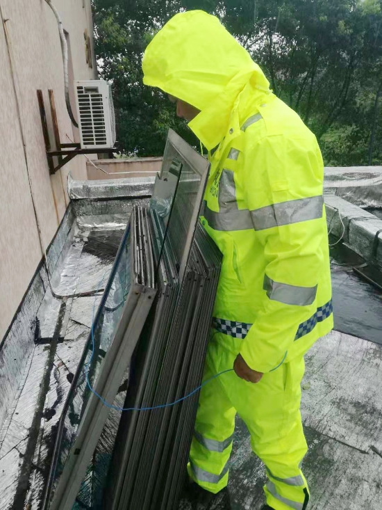 圖為工作人員捆扎散落的物品 8月9日上午,超強臺風帶來強降雨,大溪嶺隧道所隊員們做好一切防臺準備,備好發(fā)電機所需燃油,保證所有車輛車況良好并加滿油;充分備好繩索、應急燈、雨衣雨靴、藥品、食物等防臺物資;檢查各類通訊線路,確保內(nèi)部通訊電話、報警電話等重要線路暢通;放下北廣場的二高桿燈。隊員們爬到屋頂,對散落的物品進行捆扎,并疏通堵塞的排水管,確保排水設施良好。所有人員全力做好防臺部署工作和防御措施,確保大溪嶺隧道一切設備正常運行,隧道平安暢通。 陳智慧