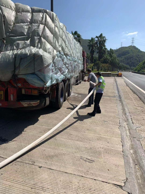 圖為消滅隱患現(xiàn)場 同時,中控員密切關注車輛動向,13:37,中控員在隧道南廣場發(fā)現(xiàn)該車,巡邏車立即奔赴現(xiàn)場,該車后輪胎剎車位置在冒煙,司機正用礦泉水澆輪胎,隊員們見狀,火速上前把消防栓打開,接上消防水帶,交與該車司機,托著消防水帶,對準輪胎接連猛射,冷卻剎車片,輪胎終于沒有冒煙,一場隱患被隊員消除了。 據(jù)悉,該輛半掛車因輪胎爆炸,引起冒煙,司機卻想著從下一個高速出口,幸好隊員們監(jiān)控及時,出警迅速,施救到位,把隱患扼殺在搖籃里,沒在隧道內發(fā)生火災,不然后果將無法想象。 現(xiàn)場,隊長告知司機,萬一車輛發(fā)生火災,請把車停在隧道外,若在隧道內發(fā)現(xiàn)車輛起火,請加速駛往隧道口,盡快駛離隧道,避免造成人員傷亡。 陳智慧
