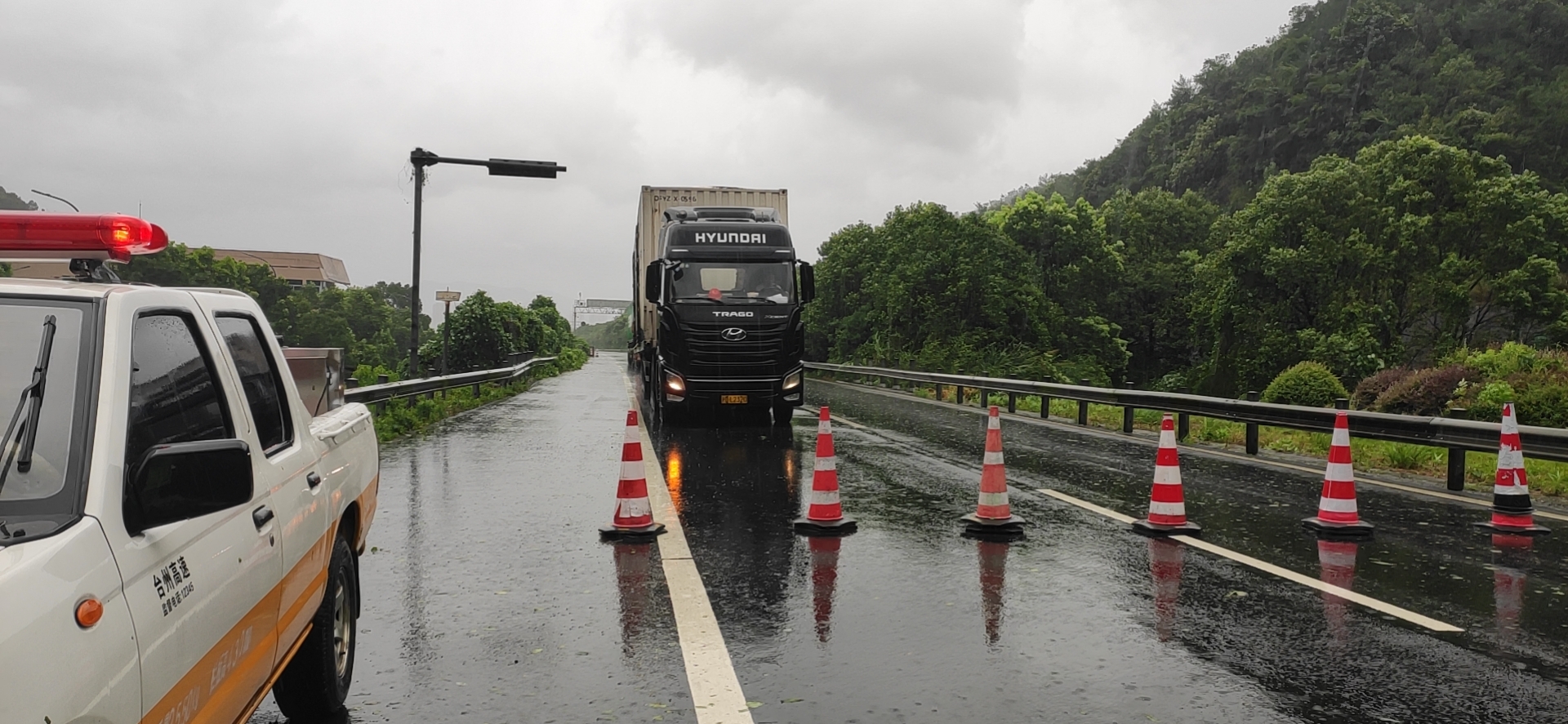 08:12分,接溫州交警通知,受臺風影響,高速上很多車輛發(fā)生側(cè)翻事故,要求隊員們在溫向隧道口進行封道,隊員們接警后立即在洞口卡口預警。
