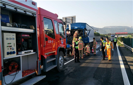 4月19日上午6點(diǎn)10分,寧向大溪出口正在進(jìn)行分流,所有車輛正緩慢前行中,一輛贛F38***牌照的藍(lán)色大貨車顯然還沒有適應(yīng)這分流的節(jié)奏,“砰”地一聲猛然撞上了前面的大貨車。 兩個(gè)“大家伙”碰撞的威力非同小可,直接的后果就是后車的車頭變形,損傷極大,貨車駕駛員被卡在車頭里出不來。 時(shí)間就是生命,施救中心迅速出動(dòng),配合交警、消防部門在現(xiàn)場(chǎng)進(jìn)行預(yù)警,并協(xié)助進(jìn)行事故處理。