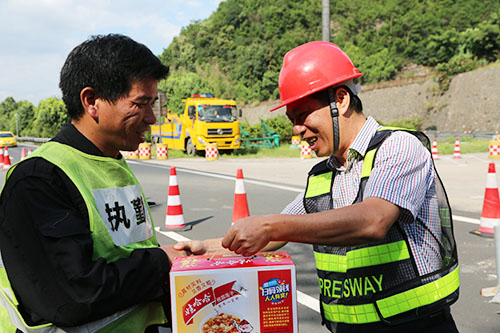 圖為集團總工程師江輝為交通疏導員送上慰問品 大溪嶺隧道溫向隧洞中,施工人員正在拆除原設備,除了噪音和洞中彌漫的灰塵,高溫高濕的環境也嚴重考驗著施工人員的身心。江輝提著慰問品,向隧洞中和烈日下正在崗位上工作的施工人員和交通疏導員送上慰問品??紤]到一線人員的特殊情況,江輝特別要求采購人員將送清涼物資改為八寶粥、蛋黃派、飲料等可以直接食用的物資,方便施工人員可以隨時補充能量。