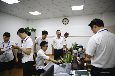 圖為集團副董事長、總經(jīng)理張建平在臨海股權收購點檢查工作人員業(yè)務操作