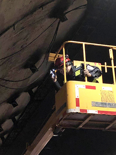 圖為各方人員集聚商討搶修方案 黃土嶺隧道所立即啟動應急搶修預案,聯(lián)合高速交警、工程養(yǎng)護部、施救中心展開緊急搶修工作。現(xiàn)場,各方人員集聚商討搶修方案、檢查安全措施、布置搶修作業(yè)。登高車上,黃土嶺隧道所執(zhí)勤二隊隊長林朝波等一批搶修人員率先清理斷落的電纜,調(diào)整接線、緊固螺栓……各項工作環(huán)環(huán)緊扣,緊張而有序。