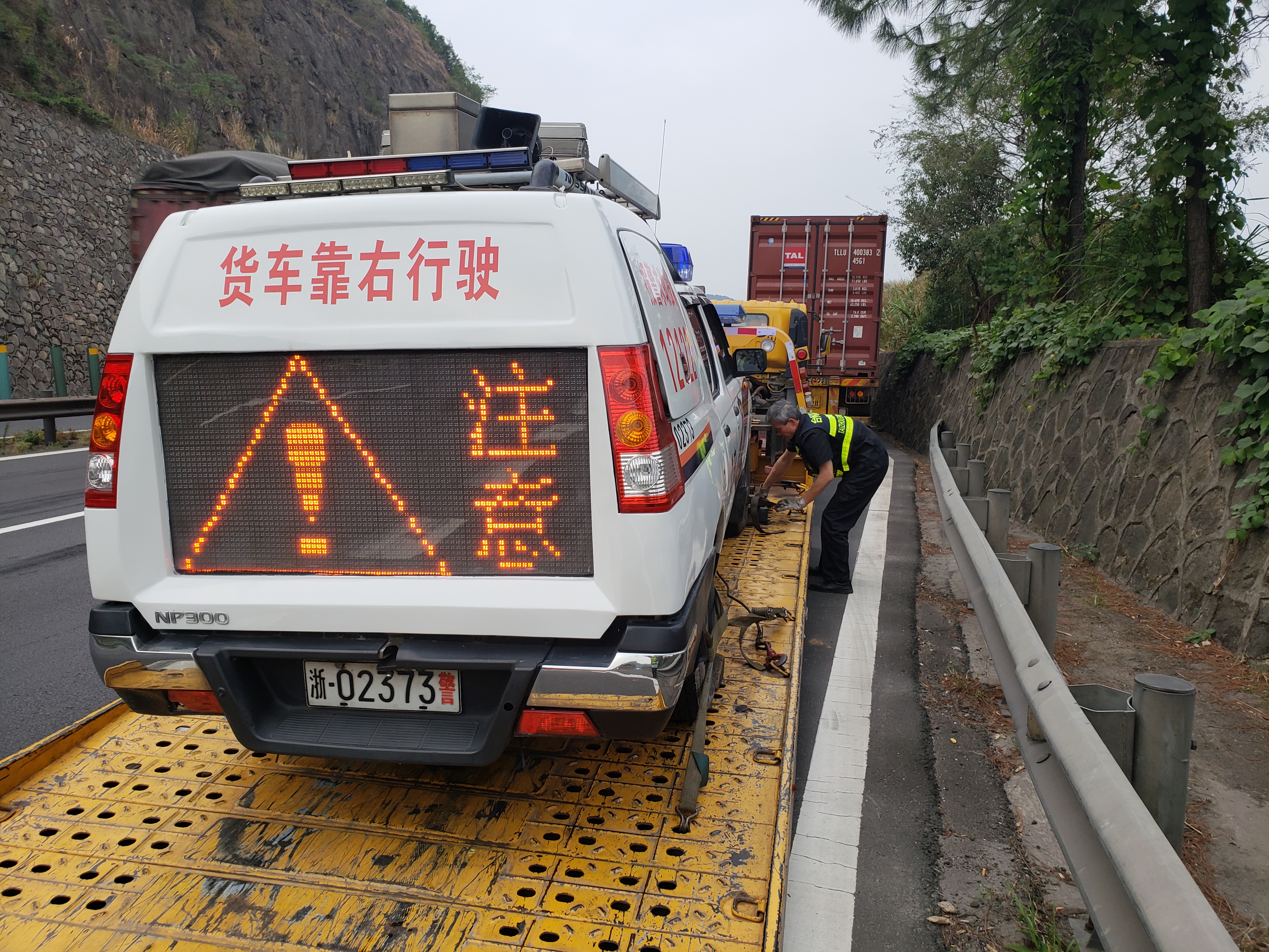 25日上午10點(diǎn),兩人在處理一輛沒有年檢已經(jīng)達(dá)到報(bào)廢標(biāo)準(zhǔn)的小面包車時(shí),接到指揮中心報(bào)警,一輛奧迪小轎車拋錨在臺(tái)州收費(fèi)站往臺(tái)州南方向出匝道位置的超車道上,需要救援。