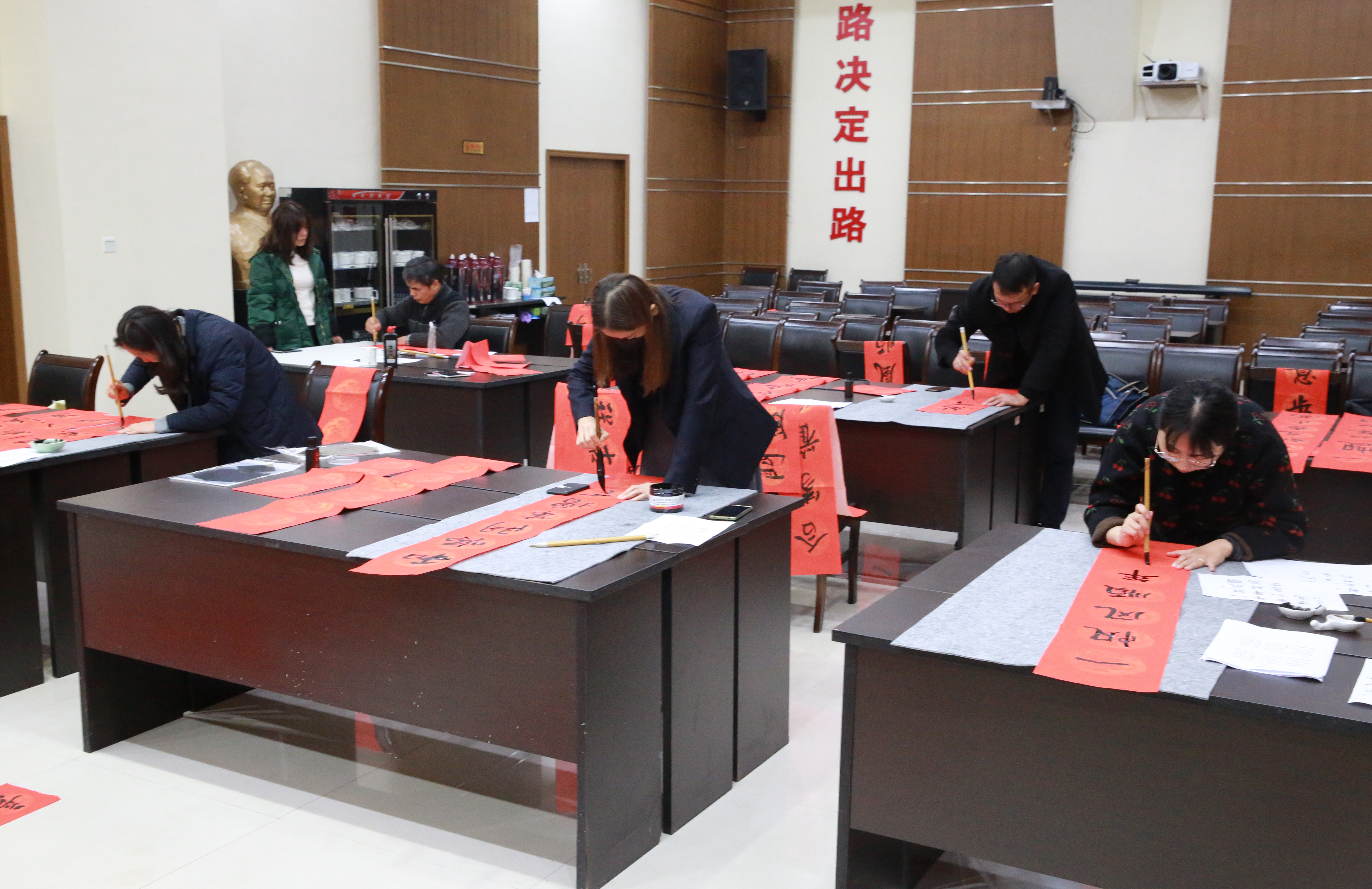 圖為學員學習寫書法 本次活動由集團辦公室牽頭組織,以集中書寫和分開書寫相結合的方式進行。參與者在百忙之中抽出自己的業余時間,積極參與到活動中來,共同書寫500多幅春聯作品。春節臨近,集團全體員工和集團兩個結對村的100戶村民都將收到暖暖的“送春聯”祝福。 當日集中書寫現場,參與者們認真埋頭書寫,并不時地相互請教學習。有的下筆蒼勁有力、筆精墨妙,有的如行云流水一筆而下,有的力透紙背,一個個大字很快躍然紙上。