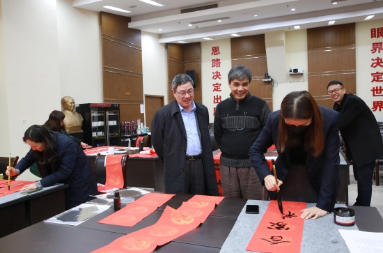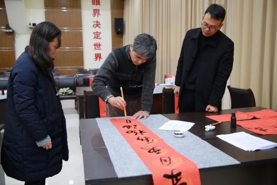 臺州高速集團開展“寫春聯、送祝福”活動 春節將至,臺州高速集團開展以“迎新春、送祝?!睘橹黝}的寫春聯、送春聯活動,并邀請書法老師到場指導。來自集團各部室、所、子公司的書法愛好者紛紛前來參與,集團董事長、總經理陳文波到場觀摩。