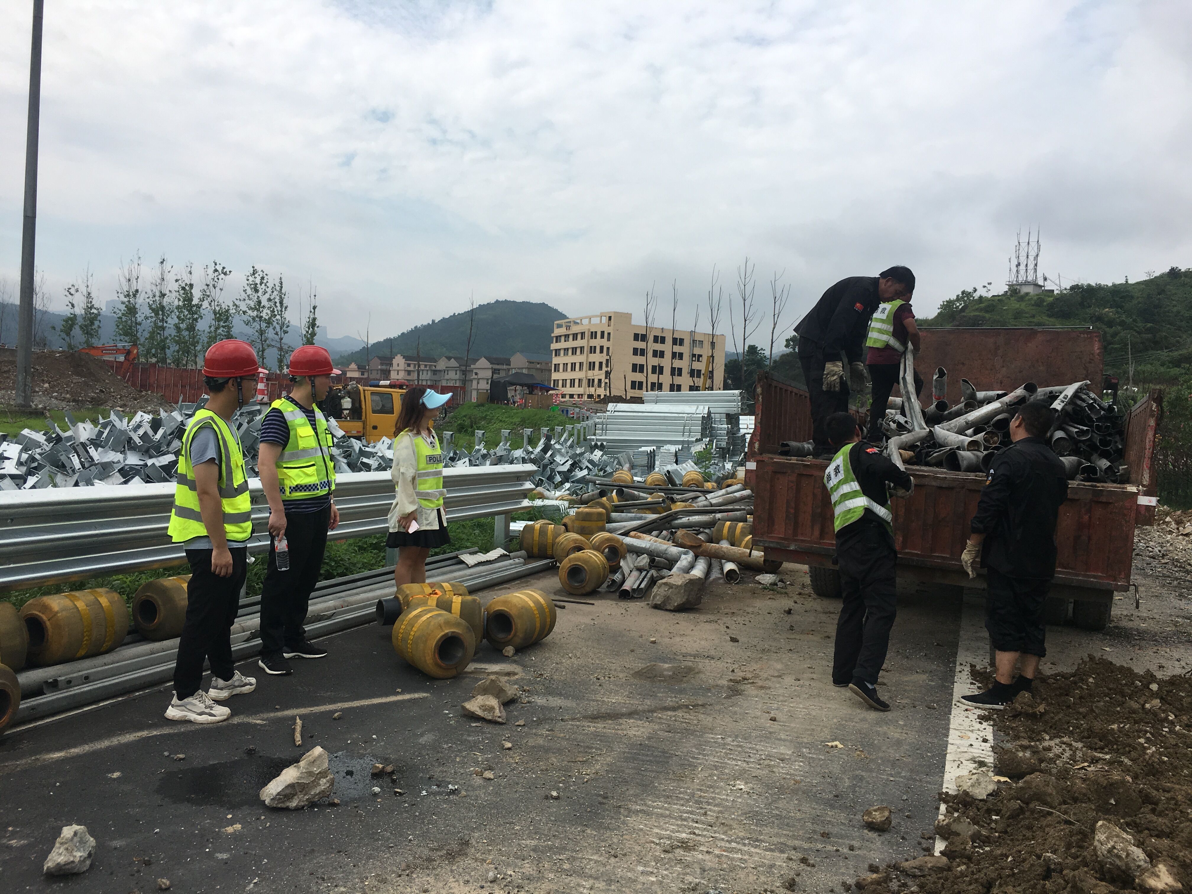 圖為廢舊物資處置現(xiàn)場(chǎng) 一大早,小組成員直接抵達(dá)事故現(xiàn)場(chǎng),戴上安全帽、穿上反光背心,伴隨著“轟隆隆”的打樁聲,大家穿過臨時(shí)為高架橋斷層搭建的鐵梯,從布滿碎石的緩坡爬上施工區(qū)。此時(shí)挖掘機(jī)、裝載機(jī)等不停作業(yè),現(xiàn)場(chǎng)灰塵彌漫,環(huán)境惡劣,大家冒著酷暑一直守在現(xiàn)場(chǎng)監(jiān)督,對(duì)廢舊物資進(jìn)行分類,逐一清點(diǎn),嚴(yán)把廢舊物資處置關(guān)。
