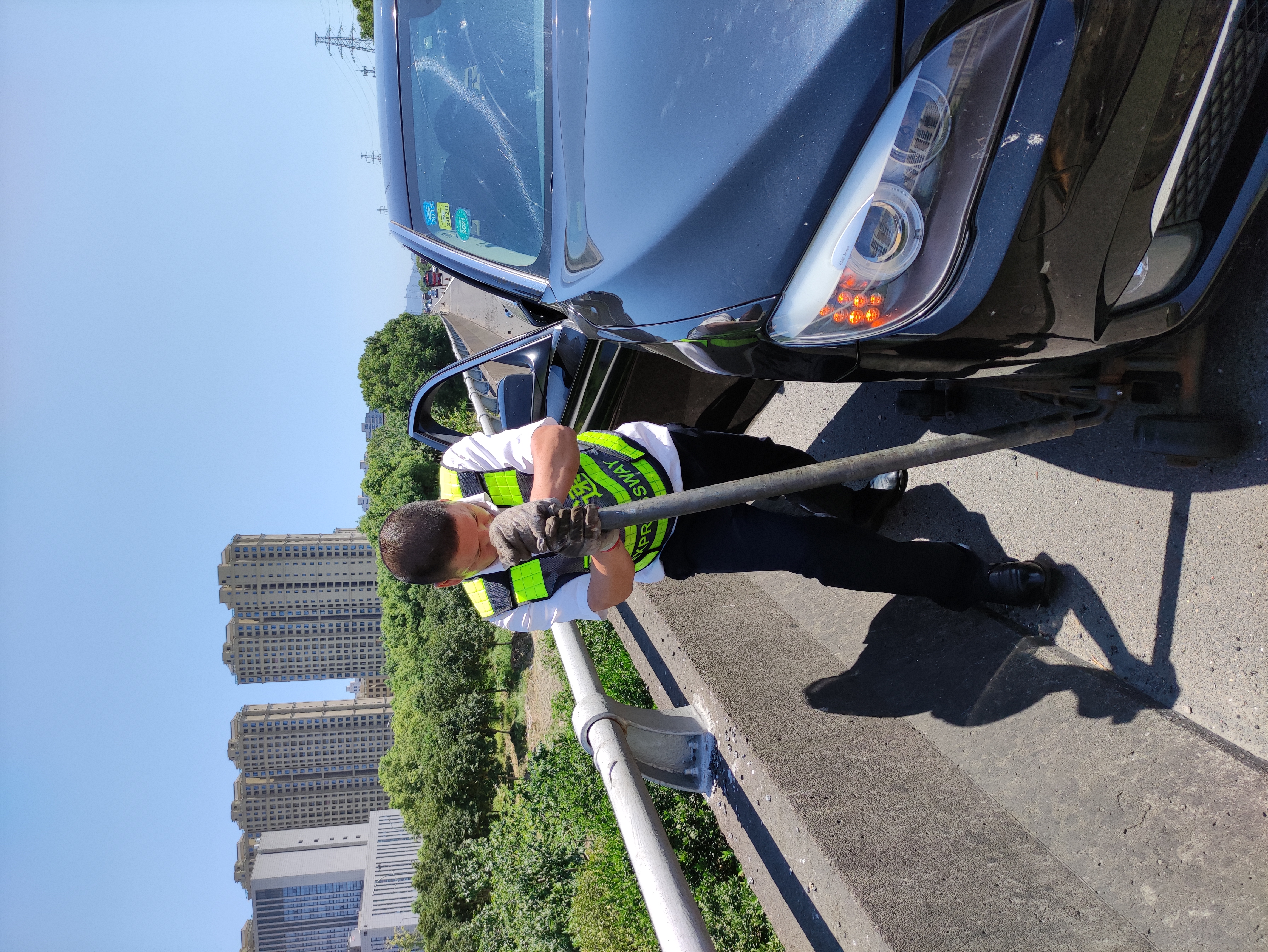 等待救援的是一輛寶馬小轎車,車子忽然發動不了,再加上高速上的炎熱和沉悶的空氣,車主很著急。