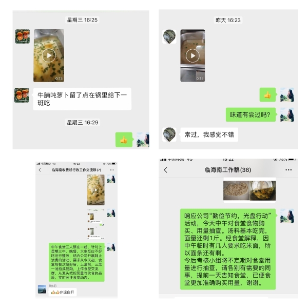 臨海南收費所不只是單單把宣傳標(biāo)語掛在墻上,擺在桌上。更把節(jié)約舉措落實到具體行動中。為了不浪費食材,行政人員提前安排一周菜單,并統(tǒng)計用餐人數(shù),規(guī)劃食材數(shù)量,食堂工作人員按照人數(shù)采購當(dāng)天食材控制成本,并將每餐燒好的菜拍成視頻上傳食堂交流群,以更好地關(guān)注食堂動態(tài),從源頭把控菜量與伙食的品質(zhì),每周還不定期抽查食堂,查看剩余量。