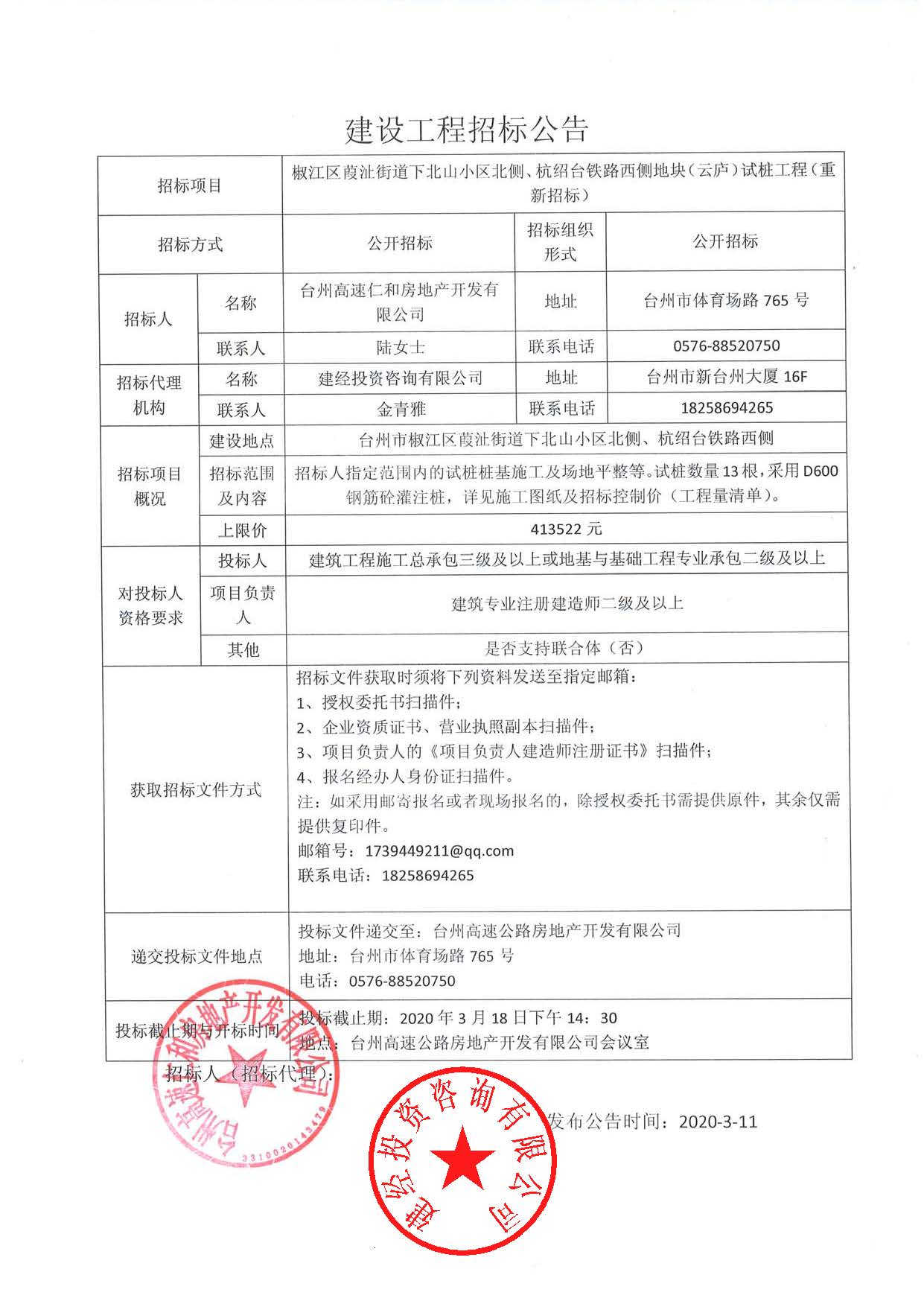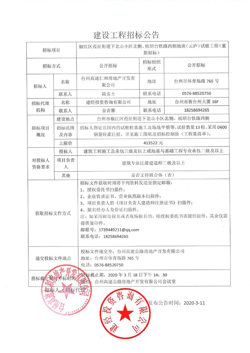 椒江區(qū)葭沚街道下北山小區(qū)北側、杭紹臺鐵路西側地塊(云廬)試樁工程(重新招標)公告