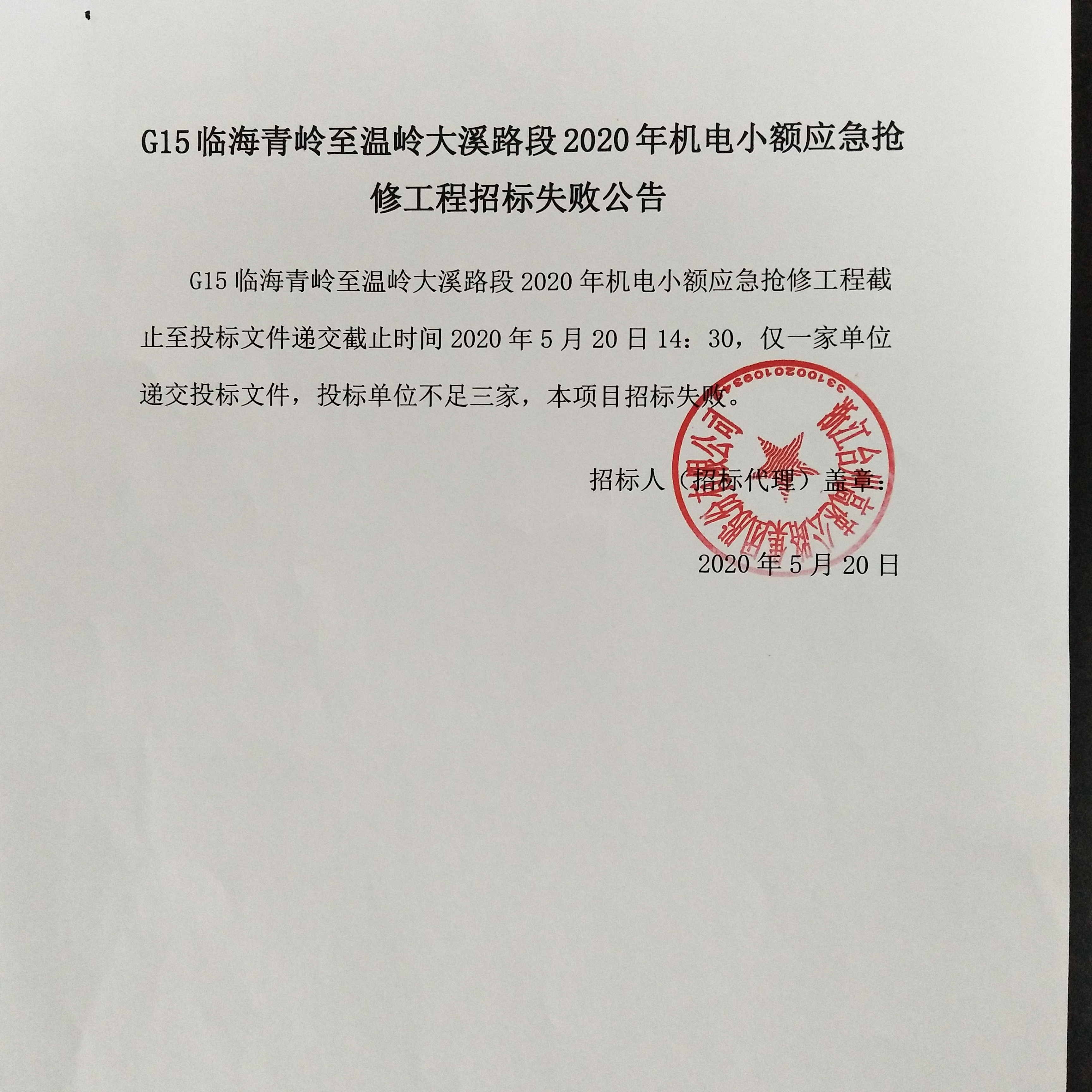 G15臨海青嶺至溫嶺大溪路段2020年機(jī)電小額應(yīng)急搶修工程招標(biāo)失敗公告