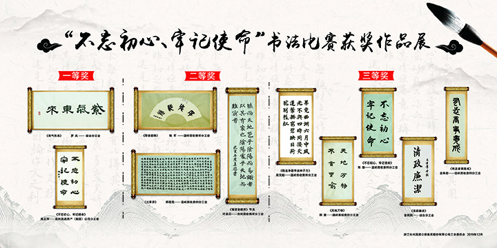 一等獎2名: 《紫氣東來》 羅 嵐 綜合分工會 《不忘初心、牢記使命》 周衛萍 臺州高速房產(集團) 公司分工會 二等獎3名: 《厚德載物》 陳 軍 溫嶺西收費所分工會 《雁塔圣教序》節選 葉美芯 臺州南收費所分工會 《蘭亭序》節選 鄭霞霞 溫嶺西收費所分工會 三等獎5名: 《曉出凈慈寺送林子方》 周文超 溫嶺西收費所分工會 《天地萬物》 鄭 星 溫嶺西收費所分工會 《不忘初心、牢記使命》 鄭 維 溫嶺西收費所分工會 《清政廉潔》 曾莉莉 綜合分工會 《有志者事竟成》 金再君 溫嶺西收費所分工會 孫明偉