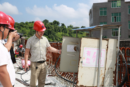 圖為檢查組檢查6#立交施工現場用電安全情況