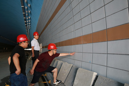 圖為檢查組在2#隧道內檢查隧道瓷磚鋪貼情況